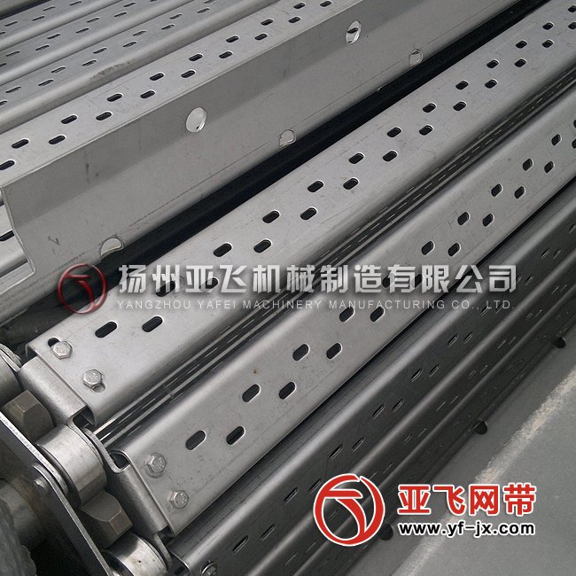 鏈條傳動網(wǎng)帶是現(xiàn)國內(nèi)主要的一種輸送形式,根據(jù)不同的輸送要求設計兩側附帶各種規(guī)格的鏈條,中間加裝連接穿桿,加強輸送帶整體的負荷能力。